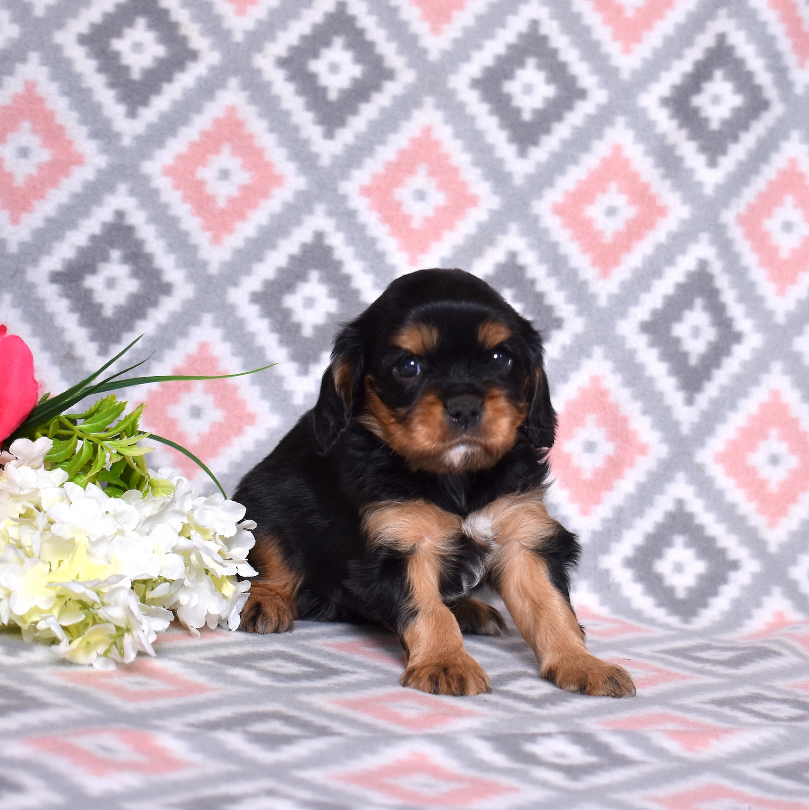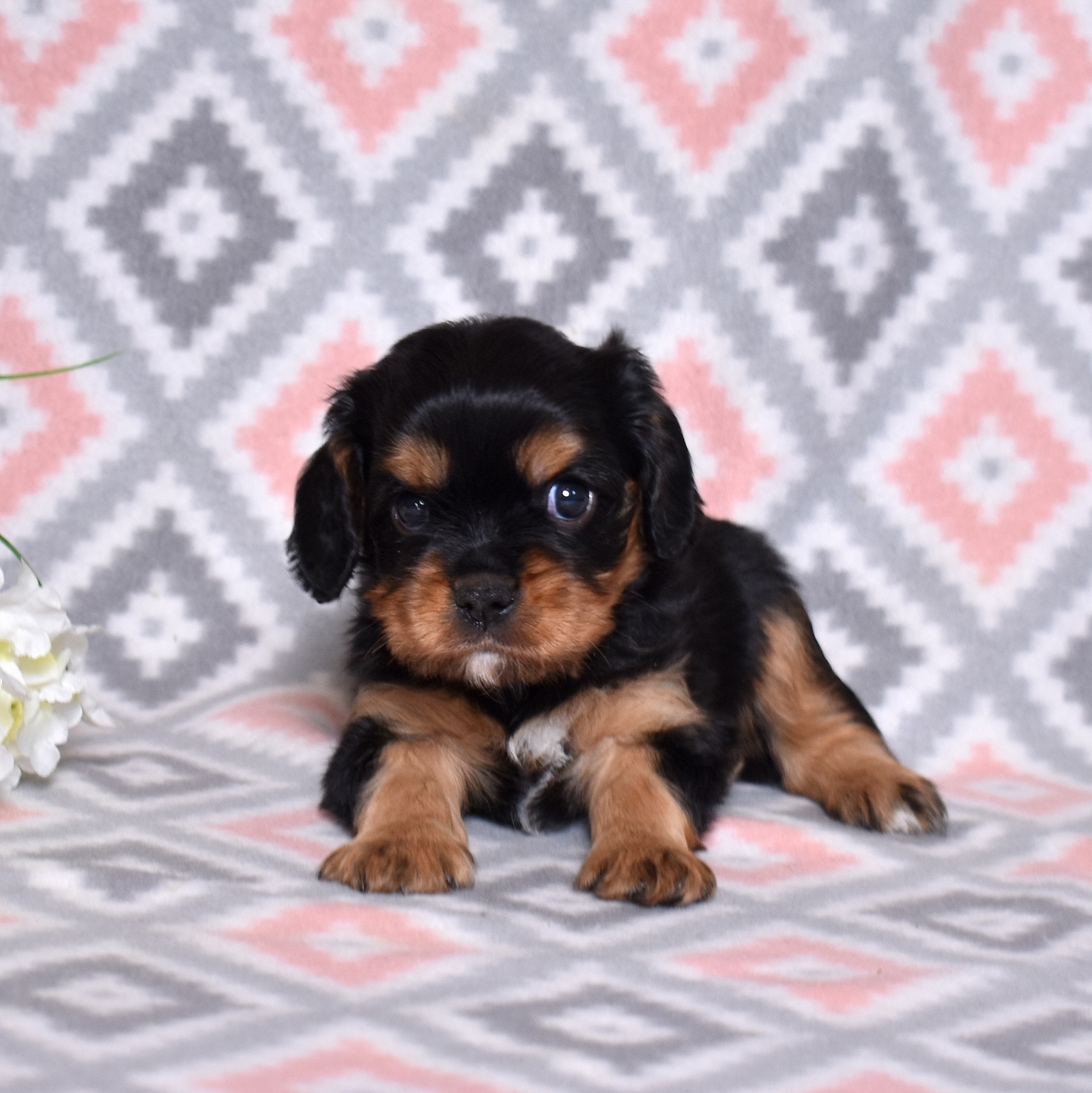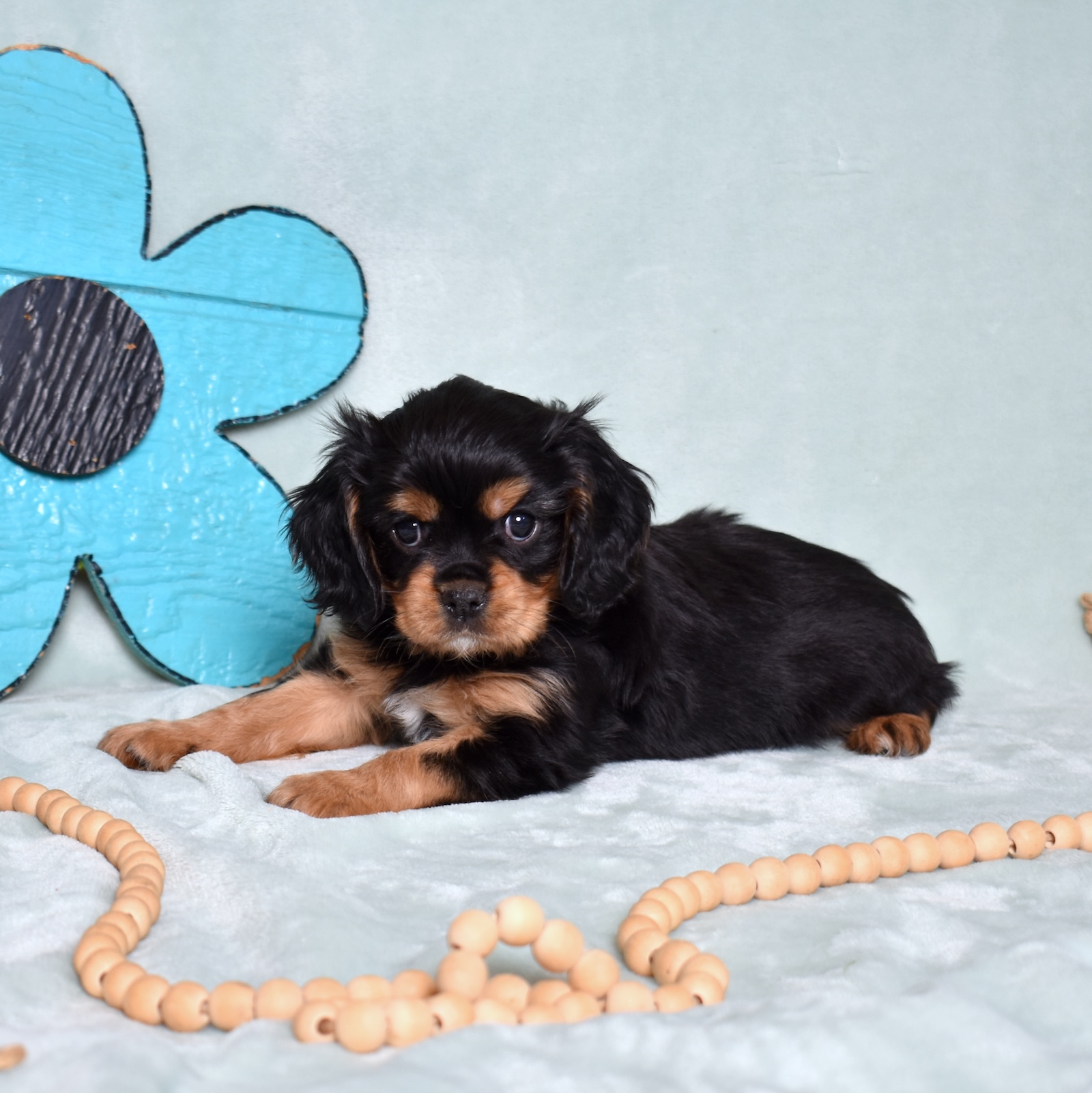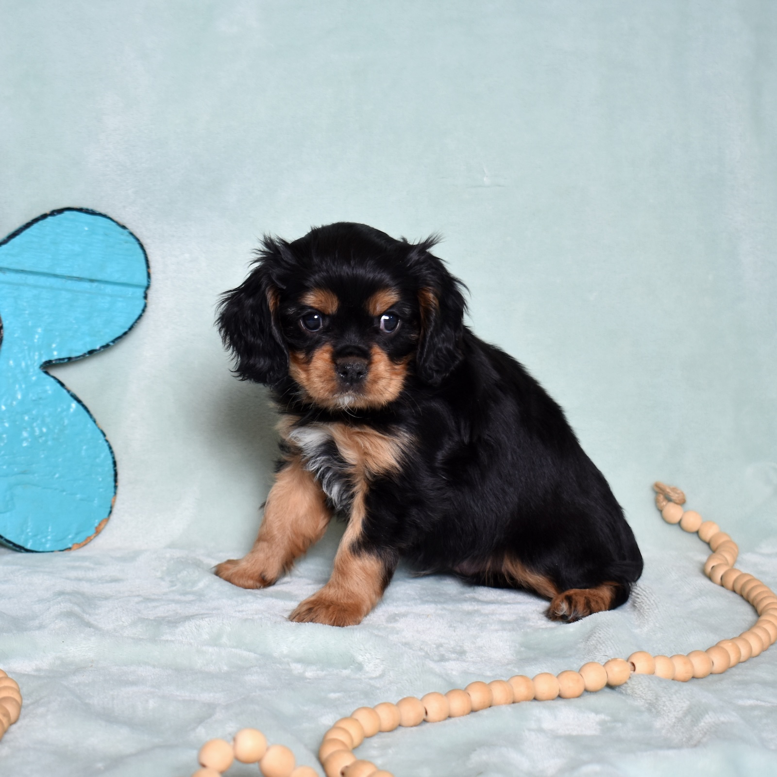 Bear is a beautiful black and tan Cavalier with a strong yet gentle presence that perfectly suits his name. His sleek black coat paired with warm tan accents creates a striking look, while his soft expression reveals the loving personality Cavaliers are known for.